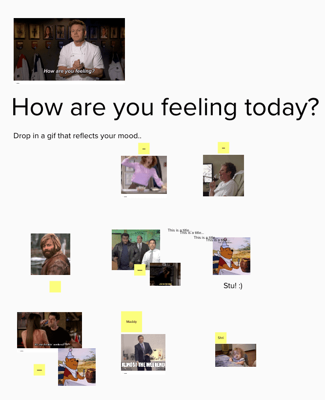 Ask team to use image, emoji or gifs to express how they are feeling today. To make it easier prepare some GIFs or image in advance, so they can be dropped in.