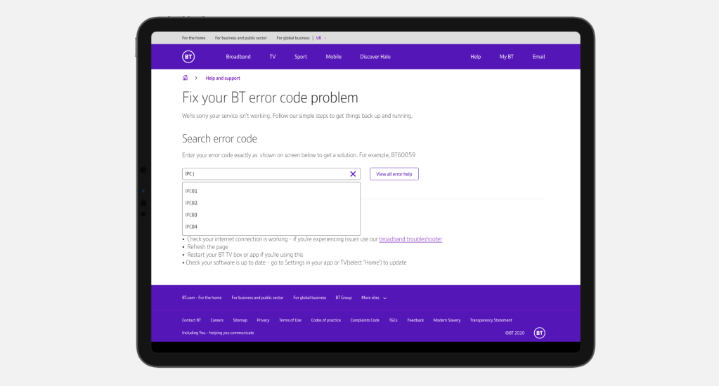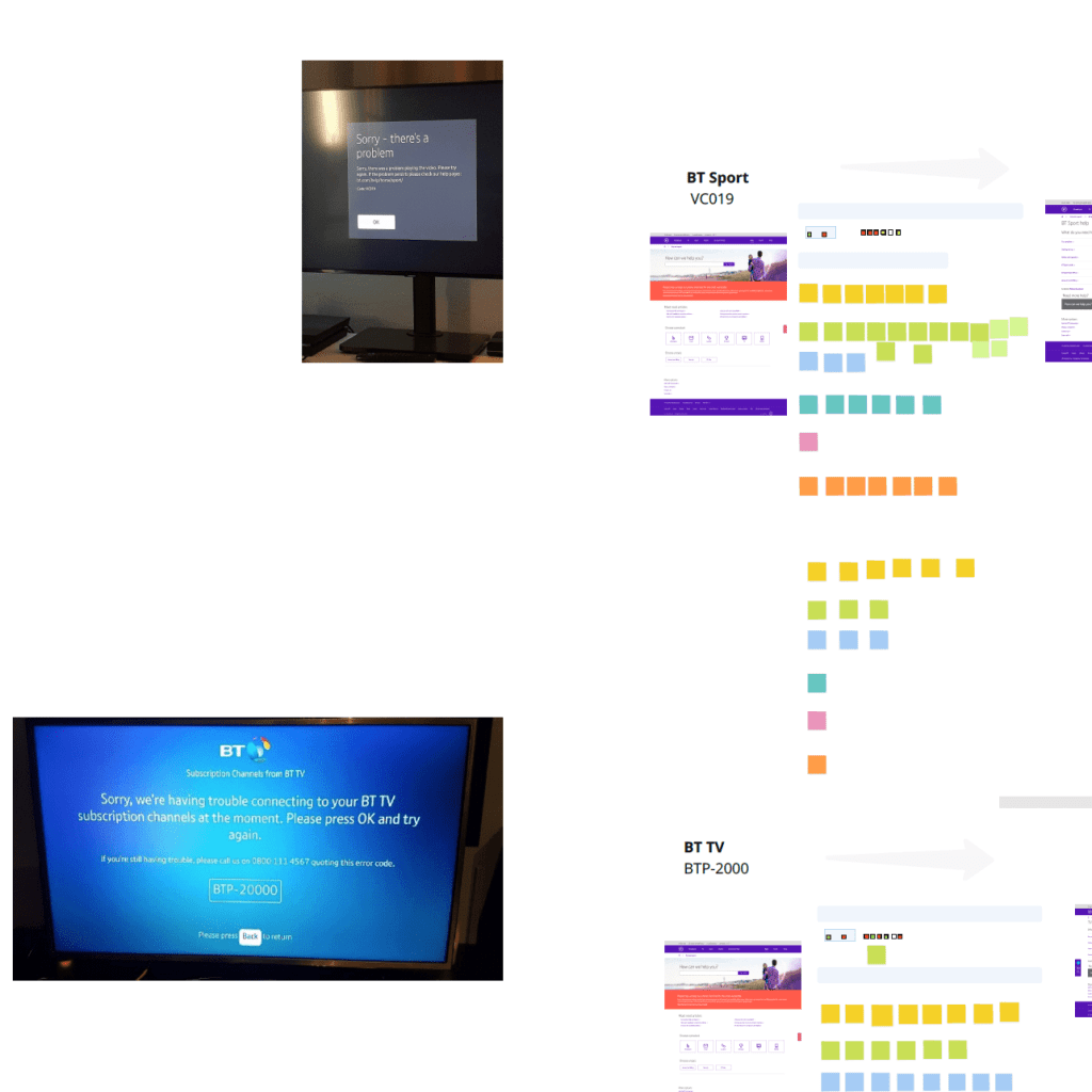 I decided, that user interviews will be a best way to gather the insight. I found examples of two real error code examples- TV and BT Sport. We showed them to the participants and asked to navigate the website. I observed session remotely.