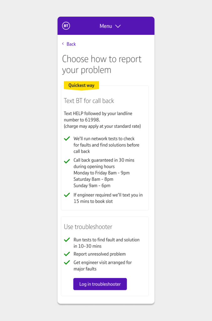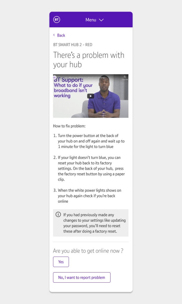 Content designer worked wit stakeholders to make sure the information is accurate and up to date. We agreed that only simple fix should be shown and if solution requires a lot of tech knowledge we would let users report it.
