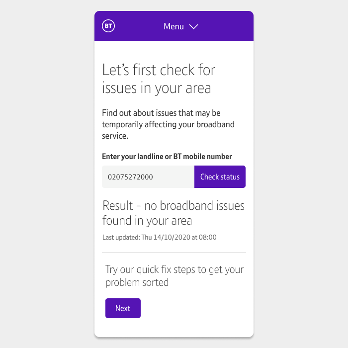 A/B test performed well, with this new journey increasing customer satisfaction rate by 5%, so now it’s a current live journey to fix the broadband.